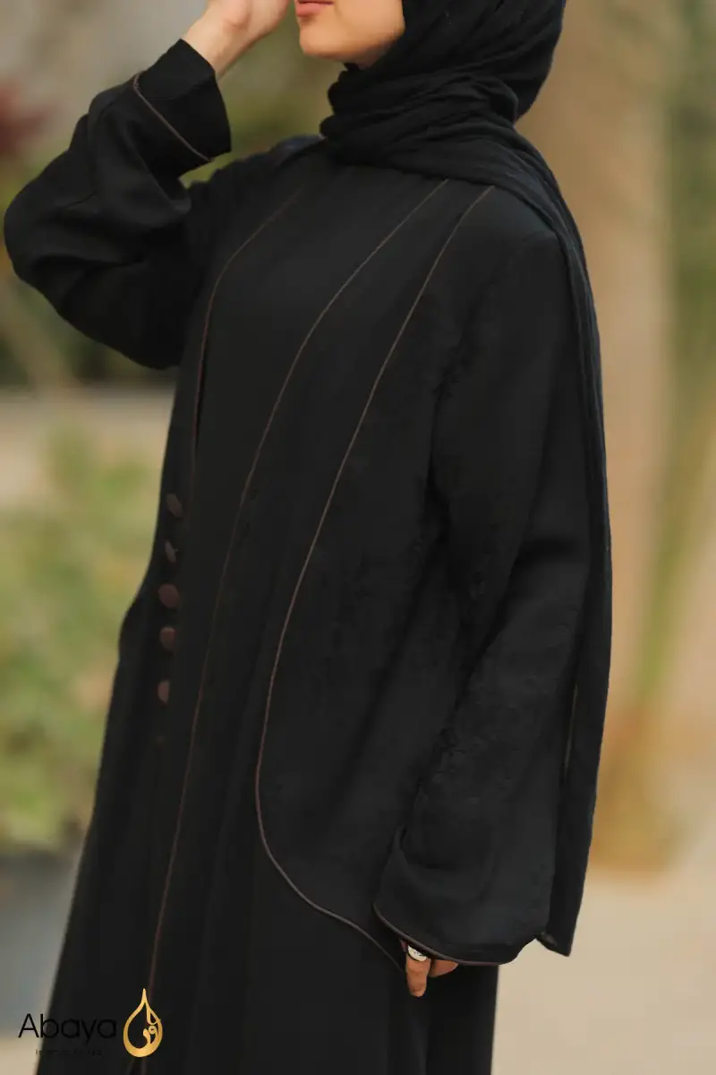 عباية بتصميم جاكت أنيق مع نقشة مميزة، تتميز بلمسة رقيقة من اللون البني تضيف لها لمسة من الفخامة. تصميمها العصري يدمج بين الأناقة والراحة، مما يجعلها مثالية للارتداء في مختلف المناسبات.
